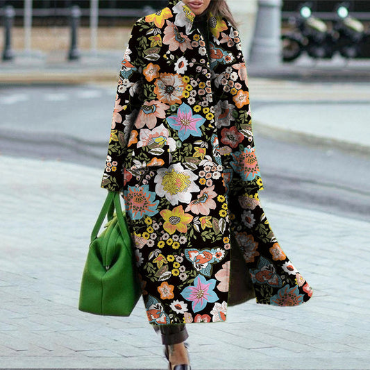 Damen Blumenmuster Maxi-Mantel mit elegantem Reverskragen und schwingendem Saum Stilzeits
