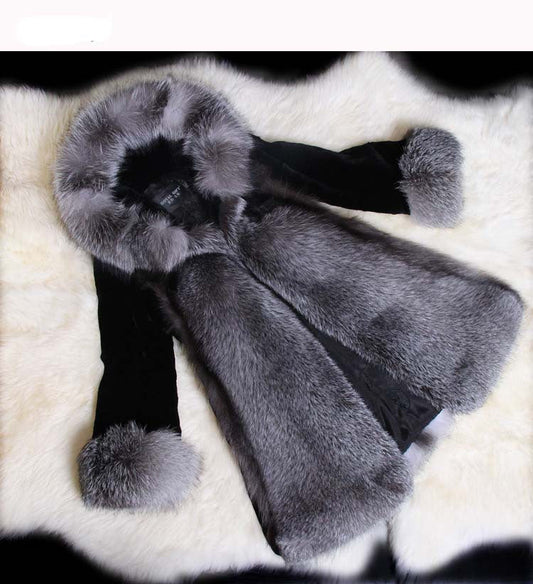 Damen Eleganter Kunstpelzmantel mit tiefem Kapuzenkragen und seitlichen Taschen Stilzeits