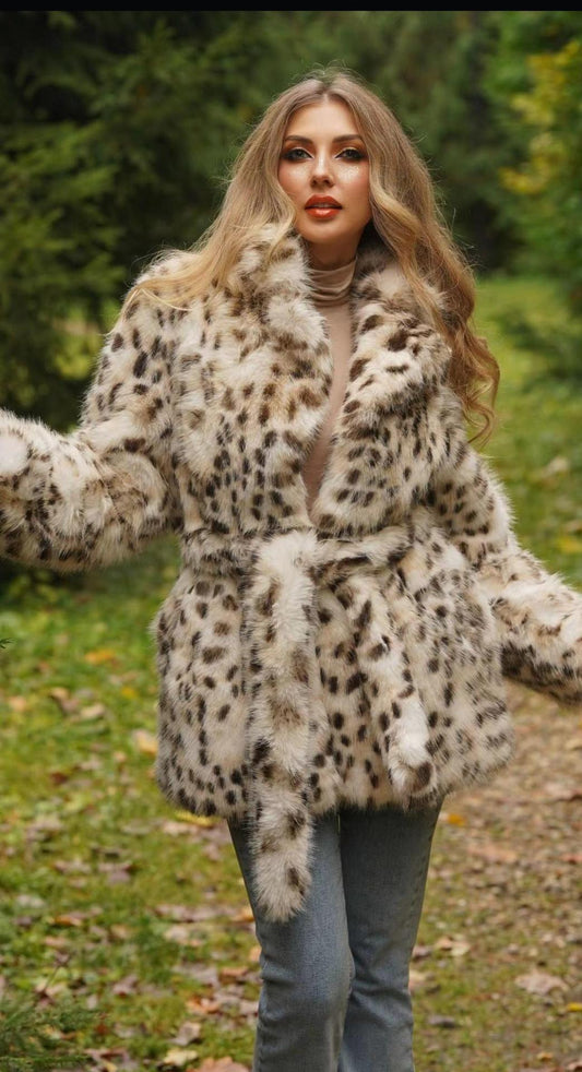 Damen eleganter Kunstpelzmantel mit Gürtel und Leopardenmuster Stilzeits