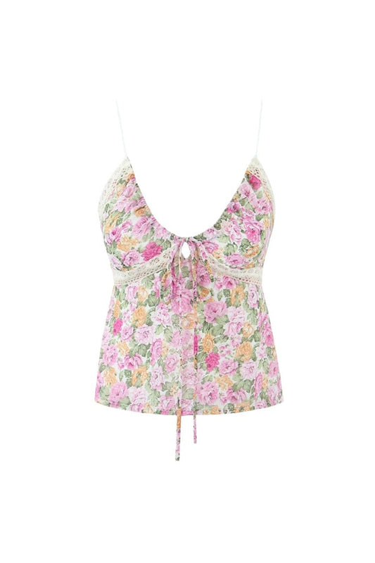 Smocked Tank Top with Floral Knot Front, V-Neck, Spaghetti Straps, and Lace Trim