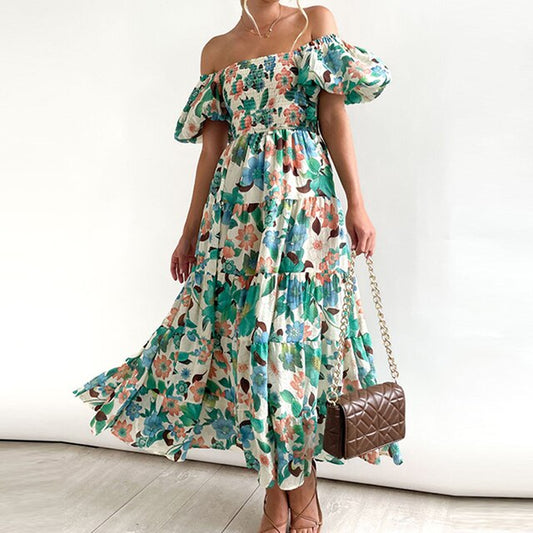 Sophie: Rüschen-Midikleid mit Puffärmeln, Carmen-Ausschnitt und Taschen
