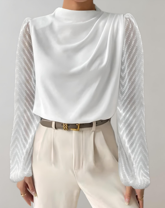 Weiße Satinbluse mit Drapierung, lange Ärmel von Fudus (Damen)
