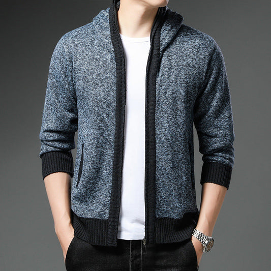Herren Moderne Strickjacke mit Kapuze und schwarz-weißen Akzenten Stilzeits