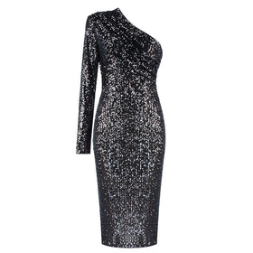 Abendkleid von Fudus mit schrägen Kragen und glänzenden Pailletten