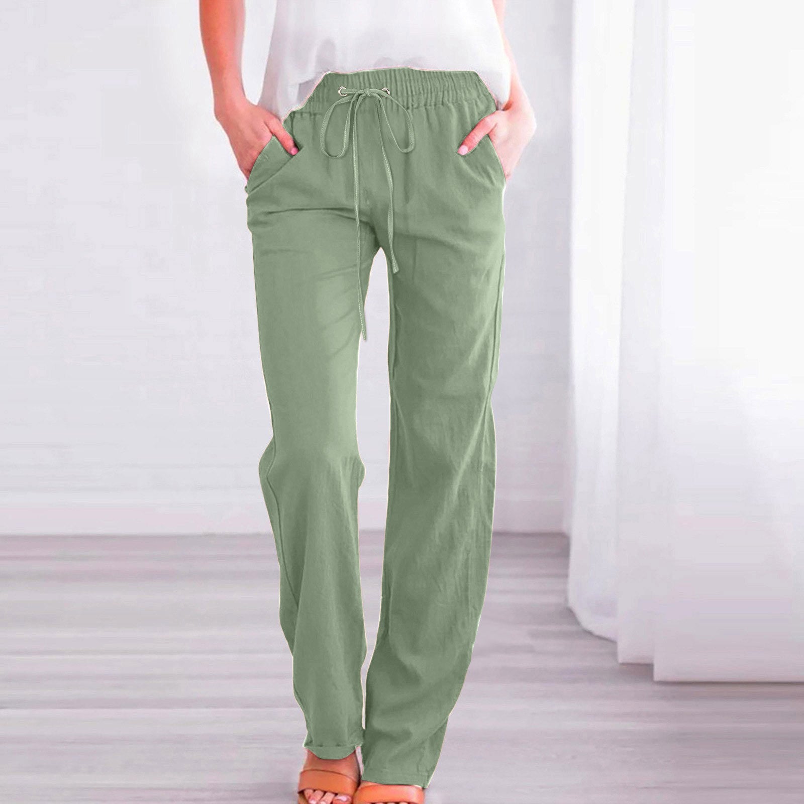 Damen Bequeme Leinen-Hose mit elastischem Bund und Taschen Stilzeits