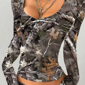 Damen Camouflage Langarmshirt mit V-Ausschnitt und modernen Details Stilzeits