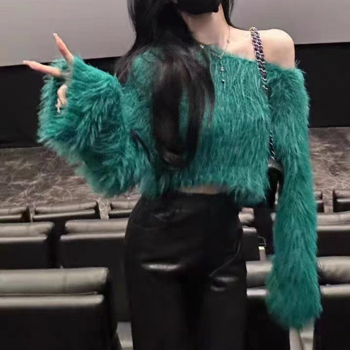 Damen cropped Pullover mit flauschiger Textur und Off-Shoulder-Design Stilzeits