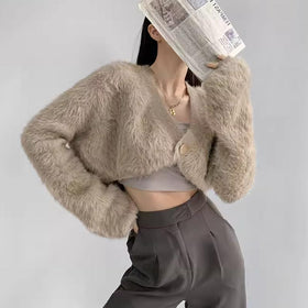 Damen cropped Strickjacke mit voluminösen Ärmeln und Knopfdetail Stilzeits