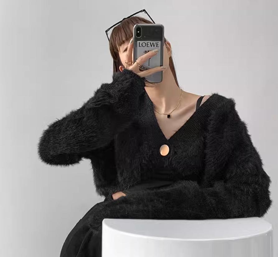 Diese stilvolle Strickjacke zeichnet sich durch ihr weiches, flauschiges Material aus, das sowohl Komfort als auch Wärme bietet. Die modernen, weiten Ärmel verleihen der Jacke eine markante Silhouette, während die Knopfdetails dem Design eine elegante Note verleihen.