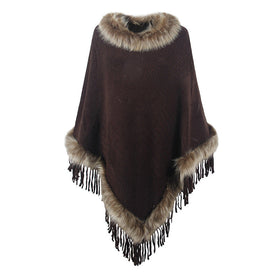 Damen eleganter Poncho mit luxuriösem Kunstfellkragen und dekadenten Fransen Stilzeits