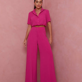 - Design: Die kurzärmelige Bluse mit Umlegekragen und Knopfverschluss verleiht dem Outfit einen modernen Touch, während die weiten Palazzo-Hosen perfekt für einen lässigen Look sind.