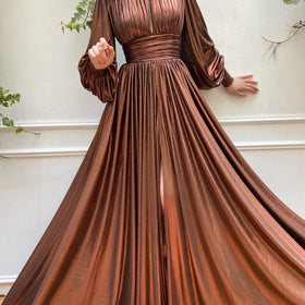 Entdecken Sie unser elegantes Maxikleid mit plissierten Details und luxuriösem Fall, das perfekt für besondere Anlässe geeignet ist. Mit seinem geschmeidigen Material und dem raffinierten Schnitt bietet dieses Kleid sowohl Stil als auch Komfort.