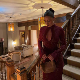 Das Kleid ist aus hochwertiger, weicher Spitze gefertigt, die eine außergewöhnliche Textur und Detailverliebtheit bietet. Die figurbetonte Silhouette schmeichelt der weiblichen Gestalt und sorgt für einen atemberaubenden Auftritt. Ein tiefes Dekolleté fügt einen verführerischen Akzent hinzu, während die langen Ärmel mit zarten Rüschenabschluss für einen romantischen Look sorgen.