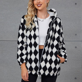 Damen Flauschige Jacke mit Karomuster und Kapuze Stilzeits