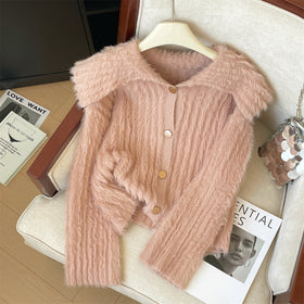 Damen Flauschige Strickjacke mit breitem Kragen und Knopfleiste Stilzeits