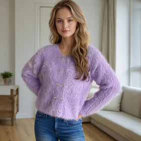 Damen flauschige Strickjacke mit herzförmigen Knöpfen und lockerer Passform Stilzeits