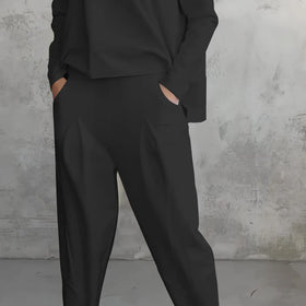 Das Damen Freizeit-Top Und Haremshosen-Set | Langarm besteht aus einem Langarm-Oberteil und passenden Haremshosen für Damen. Das Modell zeigt klare Linien und ein schlichtes Design, das sich für verschiedene Freizeit- oder Alltagsoutfits eignet. Oberteil und Hose können zusammen oder separat kombiniert werden.