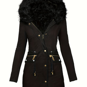 Der Damen Freizeit Winter Parka mit Kapuze ist für die kalte Jahreszeit gestaltet. Das Modell verfügt über lange Ärmel, eine durchgehende Reißverschluss- oder Knopfleiste vorne und eine integrierte Kapuze. Der Parka lässt sich mit Hosen, Pullovern oder Schuhen kombinieren, um unterschiedliche Winter-Outfits zu gestalten.