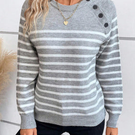 Damen gestreifter Pullover mit dekorativen Knopfdetails und Rundhalsausschnitt Stilzeits