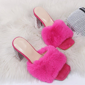 Damen Glamouröse Mules mit kuscheligem Kunstfell und glitzerndem Absatz Stilzeits