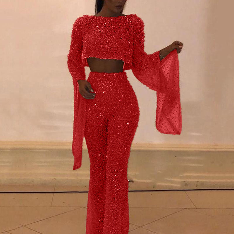 Damen Glitzerndes Zweiteiliges Set mit weitem Bein und langen Ärmeln Stilzeits
