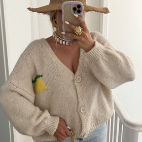 Damen Grober Strickcardigan mit einzigartigem Zitronenmotiv und knopfbarem Verschluss Stilzeits