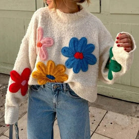 Damen Grobstrick Pullover - Oversized Passform mit 3D Blumen Applikationen