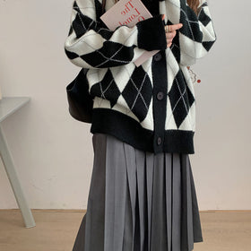 Damen Grobstrickjacke mit modernem Rautenmuster und Knopfverschluss Stilzeits