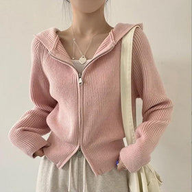 Damen lässige Strickjacke mit Kapuze und Reißverschluss Stilzeits