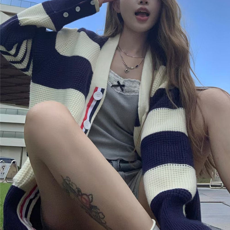 Damen lässiger Strickcardigan mit gestreiftem Muster und praktischen Taschen Stilzeits