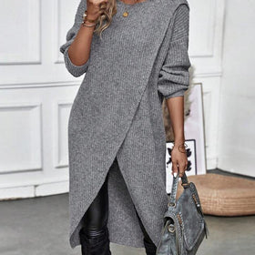 Damen Midi-Pulloverkleid - Lange Ärmel mit Asymmetrischem Wickel-Stil
