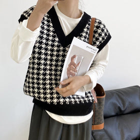 Damen modische Strickweste mit graphischem Hahnentrittmuster Stilzeits
