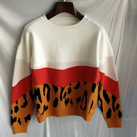 Entdecken Sie unseren modischen Damen-Pullover im angesagten Colorblock-Design, der die perfekte Kombination aus Stil und Komfort bietet. Dieser Pullover besticht durch seine auffälligen Farben und das trendige Leopardenmuster, das ihm einen einzigartigen Look verleiht.