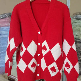 - Design: Auffälliges Rautenmuster in Rot und Weiß, verziert mit niedlichen Herzknöpfen für einen verspielten Chic.