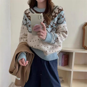 Damen Strickpullover mit grafischem Norweger-Muster und hohem Rundhalsausschnitt Stilzeits