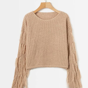 Damen trendiger Grobstrickpullover mit fransigen Ärmeln Stilzeits
