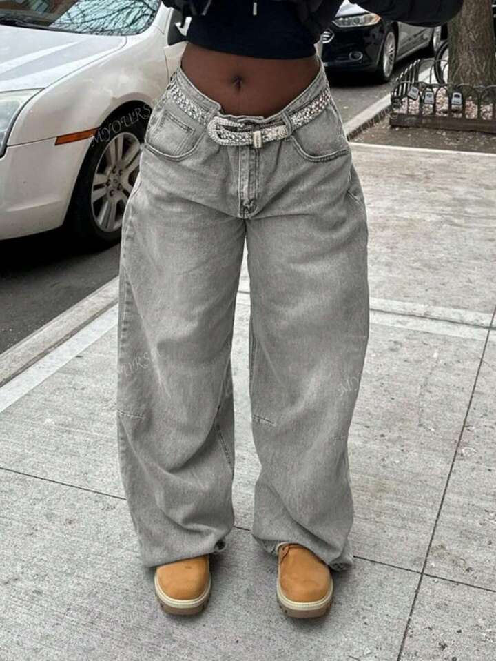 Damen Weit geschnittene Jeanshosen mit funkelndem Gürtel Stilzeits