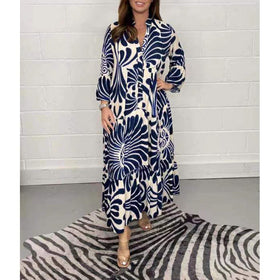 Schickes Einteiliges Maxikleid im Stadtstil. V-Ausschnitt, zum Hineinschlüpfen, mit ¾-Ärmeln. Musterthema. Abendkleid.