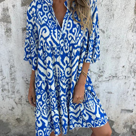 Elegantes Fudus Kleid mit Frühlings-Sommer-Print, Volants und V-Ausschnitt