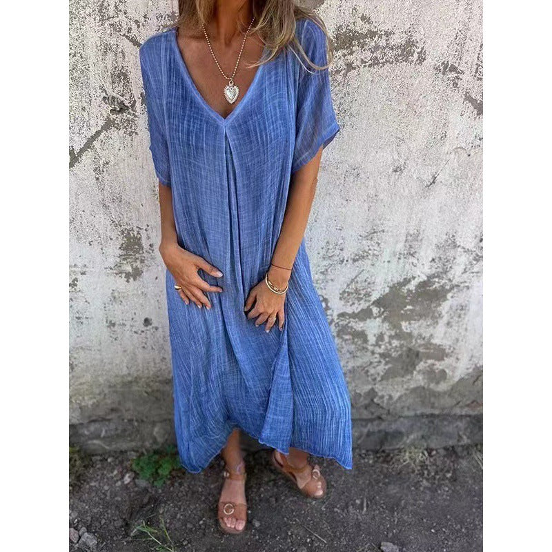 Beruflicher Midirock, Patchwork-Design, V-Ausschnitt. Hauptstoff: Leinen. Kurze, reguläre Ärmel. Einfarbig. Einzelstück. Pendler-Look.
