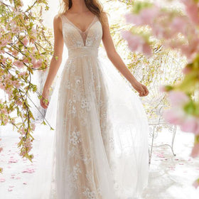 Elegantes Spitzen-Hochzeitskleid von Fudus mit V-Ausschnitt und ärmelloser Ausführung