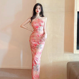 Promi Privatkleid, Einteiler, Lang, Halterneck, Rückenfrei, Halter Stil, Pullover, Ärmellos. Patchwork/Splicing.