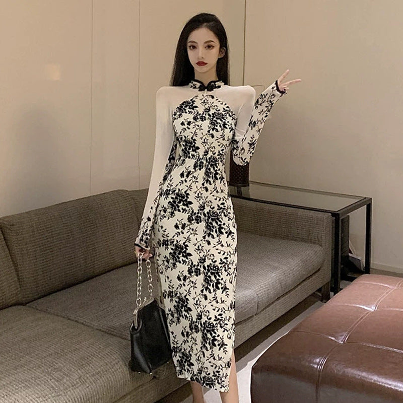Exklusiver Server-Socialite Einteiler Abendkleid. Voll-Länge Rock, Hochkragen, Schlitz. Klassischer und verführerischer Stil. Verlängerte Ärmel. Flickarbeit/Splicing.