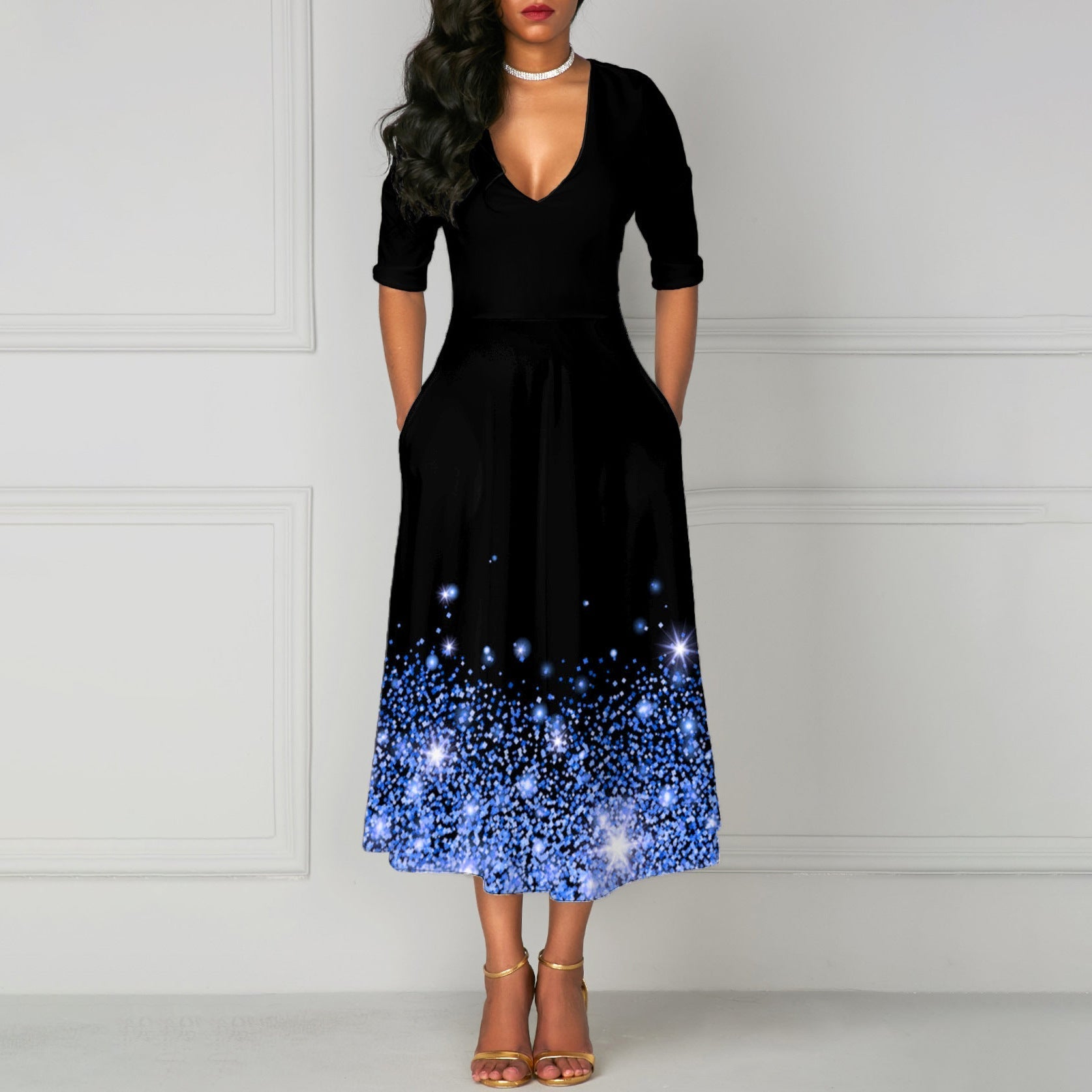 Arbeit Kleid, V-Ausschnitt, halblanger Ärmel, volllanger Rock. Basic, Pendler Stil. Druckdesign.