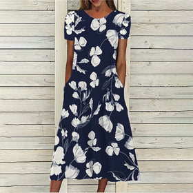 Einzelstück Maxirock Kleid mit Rundhalsausschnitt und kurzen Ärmeln. Lässiger Pendler-Stil, bedrucktes Design.