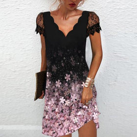 Fudus modisches Wellenmuster-V-Ausschnitt-Spitzenkleid mit kurzen Ärmeln