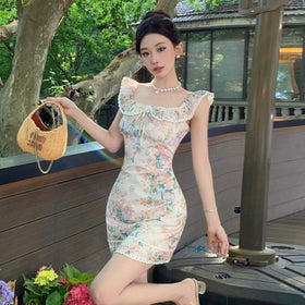 Privater Promi-Stil. Einzelstück. Kurzrock. Quadratischer Ausschnitt. Rückenfrei. Ärmellos. Sexy Kleid. Zusammensetzung/Flicken.