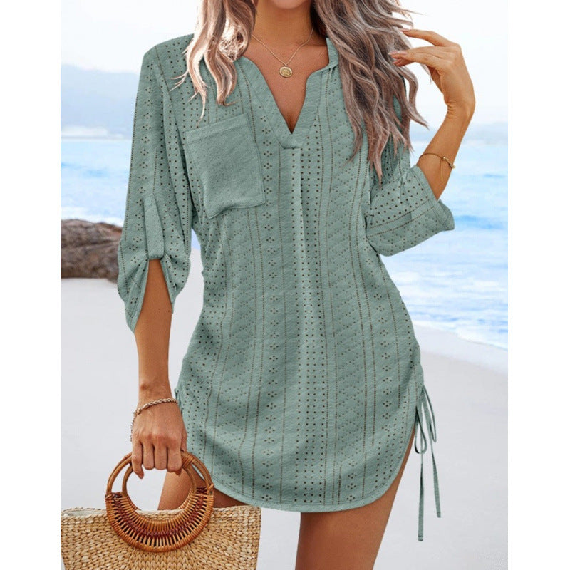 Lässiges Kleid im Pendlerstil. Kurzer Rock, V-Ausschnitt. Lange Ärmel, regulärer Ärmeltyp. Pullover-Verschluss. Patchwork/Splicing Design mit Bindeelementen. Einzelartikel.
