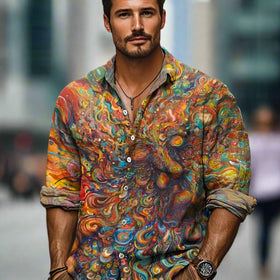 Dieses gemusterte Langarmhemd ist ein echter Blickfang mit seinem abstrakten Design aus wirbelnden Farben und einem malerischen Effekt. Sichtbare Pinselstriche und verschiedene Farbnuancen verleihen dem Hemd eine einzigartige visuelle Struktur, während der leichte Stoff für ein angenehmes Tragegefühl sorgt. Perfekt für legere Anlässe oder als kreatives Statement in stilvollen Outfits.