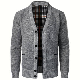 Herren Hellgrauer Strick-Cardigan – Kariertes Innenfutter